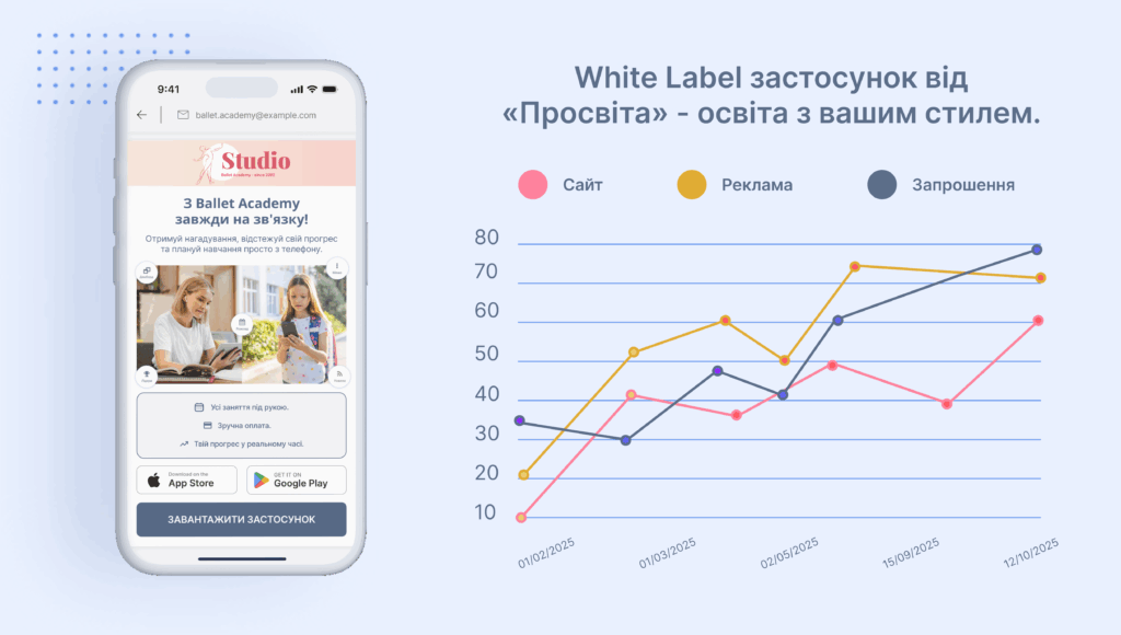 Платформа «Просвіта» дозволяє створювати власні фірмові мобільні застосунки для шкіл, ліцеїв, курсів і позашкільних центрів. Тепер кожен заклад може мати брендований застосунок із логотипом та унікальним стилем.