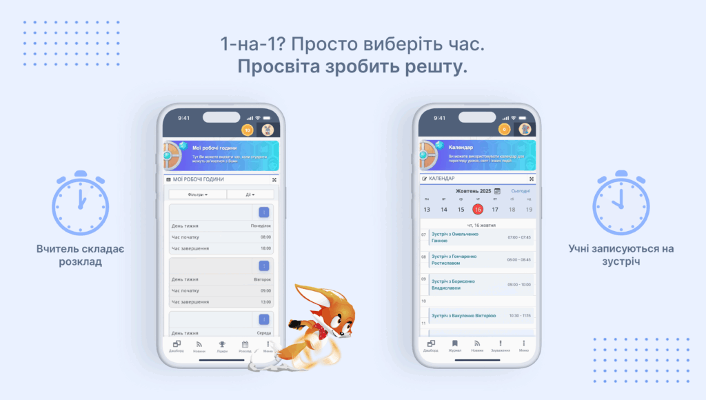Новий блок для вчителя – «Робочі години» (день тижня, час початку та завершення) – допомагає швидко опублікувати «вікна» для консультацій, атестацій і перевірок. Запис – без плутанини, у зручний час для обох сторін.