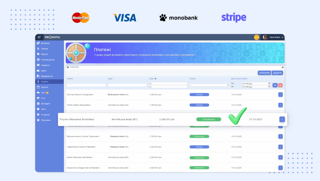 - Облік оплат, підписок і повторюваних платежів – прозоро для адміністраторів, зручно для батьків.