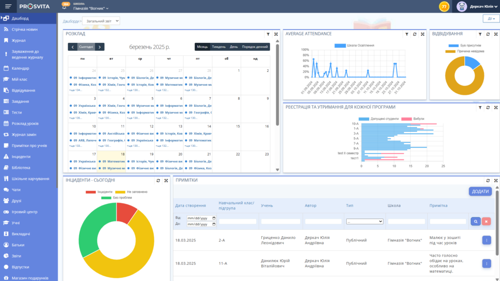 Не менш важливою є система фіксації інцидентів. Вчителі можуть швидко повідомляти про будь-які проблеми на уроці: конфлікти між учнями, порушення дисципліни або інші надзвичайні ситуації. Усі ці дані з’являються в загальному звіті, що допомагає керівництву оперативно реагувати на ситуації.
